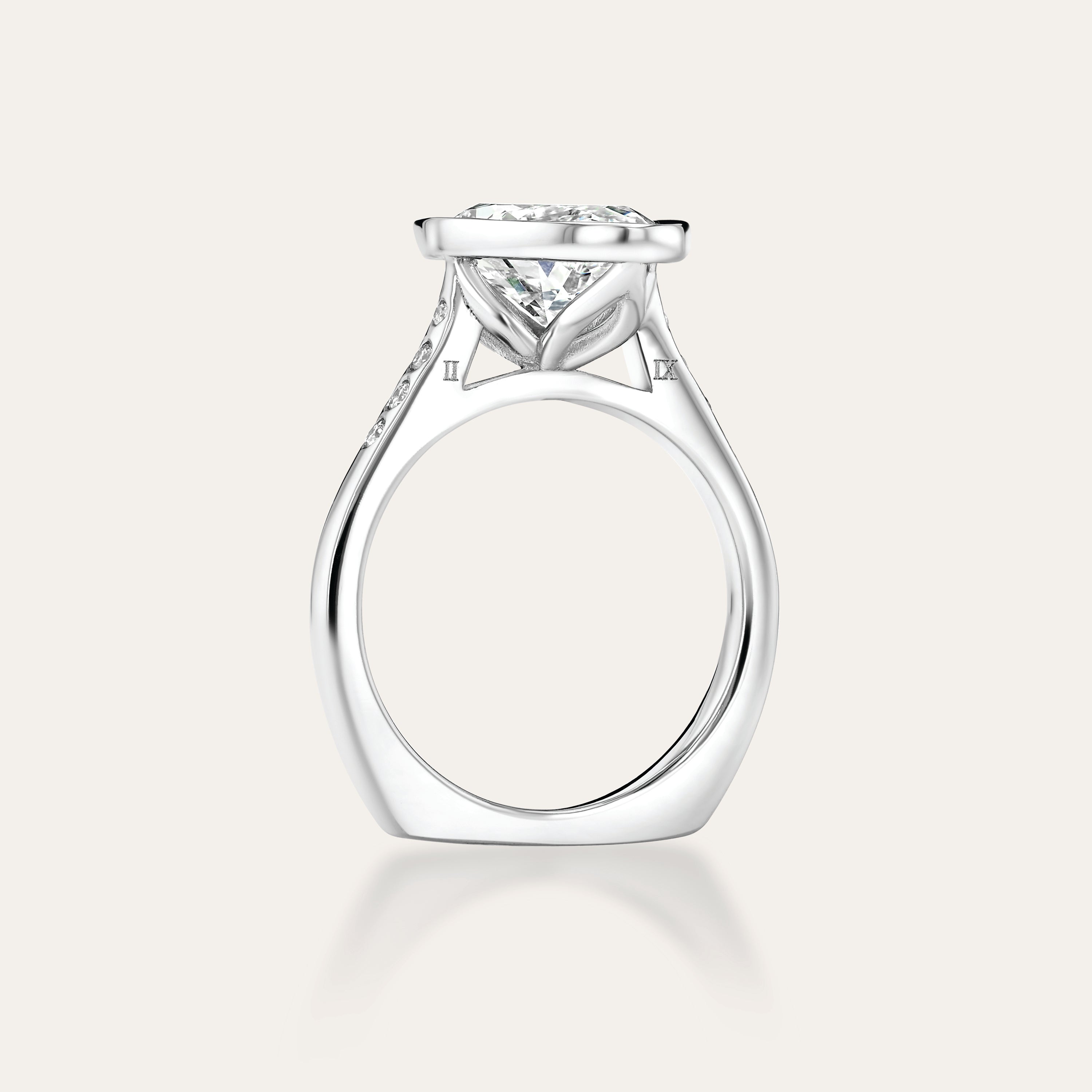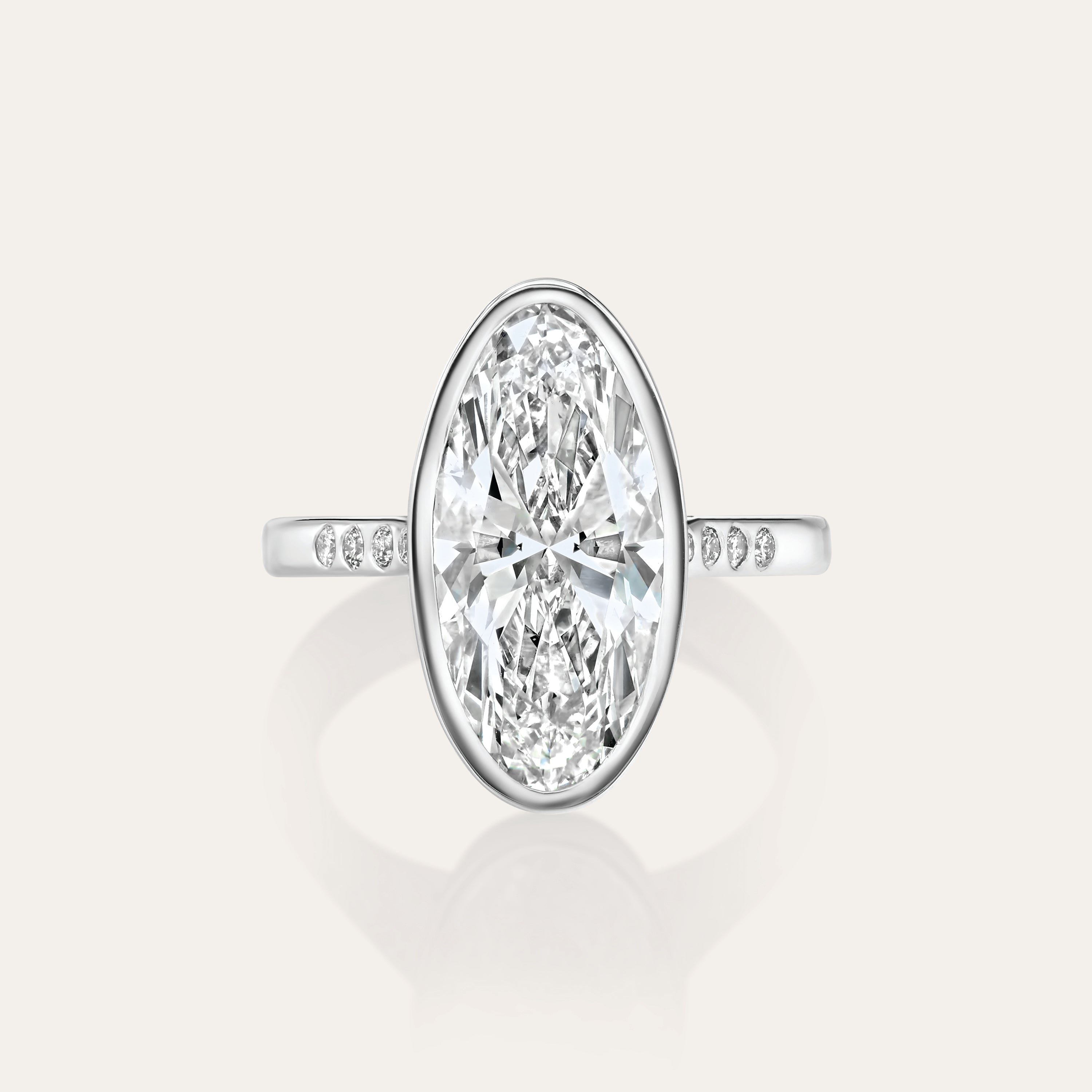 Modern, yet timeless engagement ring. Featuring a Moval center stone on a euro shank band in our signature bezel setting.